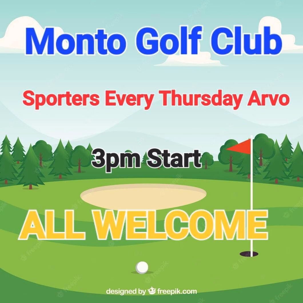 Every Thursday afternoon 3pm Tee-off 9 Holes Come down to Monto Golf Club for the Sporters Social Event every Thursday! Tee off at 3 pm for 9 holes of relaxed, friendly golf. Perfect for all skill levels, it’s a great way to unwind, meet fellow golfers, and enjoy the course in a fun, social atmosphere.